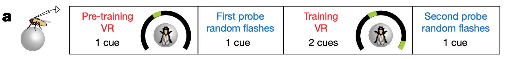 為了證明果蠅擁有地圖重建構的功能,在受到新的刺激後依然能不迷失方向,在這裡他們讓果蠅站上一顆能供他行走的球體,並在四周圍上能隨機產生光幕的光屏來進行視覺刺激。(Figure 3.)