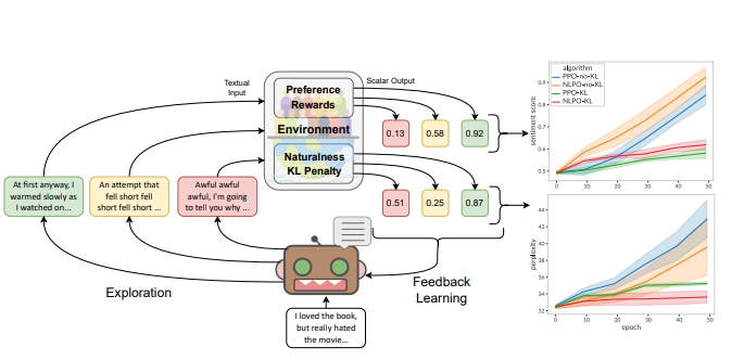 | 圖(一) 情感引導(人類的偏好)下的自然語言策略優化(NLPO):本研究,語言模型(即策略)需要根據評論提示產生正面情感的延續作為獎勵的人類偏好的自動代理(這裡:情感分類器)通過與未經明確人類反饋訓練的語言模型的KL散度來衡量“自然性”。 |