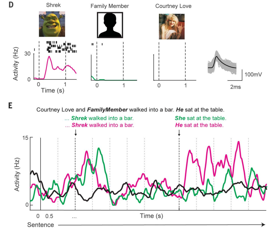 他們在受試者的海馬迴放入電極,如圖三,可看到在受試者的大腦中存在著「史瑞克神經元」。只對於史瑞克有較高的神經元反應。接著研究團隊念句子給受試者聽,首先黑色的曲線代表在念黑色的句子時,由於沒有史瑞克的出現,該神經元活性都在低的位置。而若是讓受試者先聽到史瑞克的名字,在下一句的時候,聽到「他」,史瑞克神經元會再度被活化,代表著他在受試者的大腦中被聯繫的史瑞克!因此活性上升。反過來,若是聽到「她」,則活性不會上升。