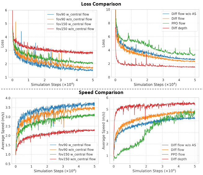 | 圖四、訓練成效比較 左列圖:中央注意力策略提升大視角相機下的效能(150° FOV表現最佳)。 右列圖:不同方法比較: -- 光流 vs 深度:深度訓練收斂較快,但光流遷移能力更佳。 -- PPO vs 可微物理:可微模擬支援解析梯度,訓練更穩定、收斂更快。 -- 主動 vs 非主動感知:主動調整視角提升表現。 |